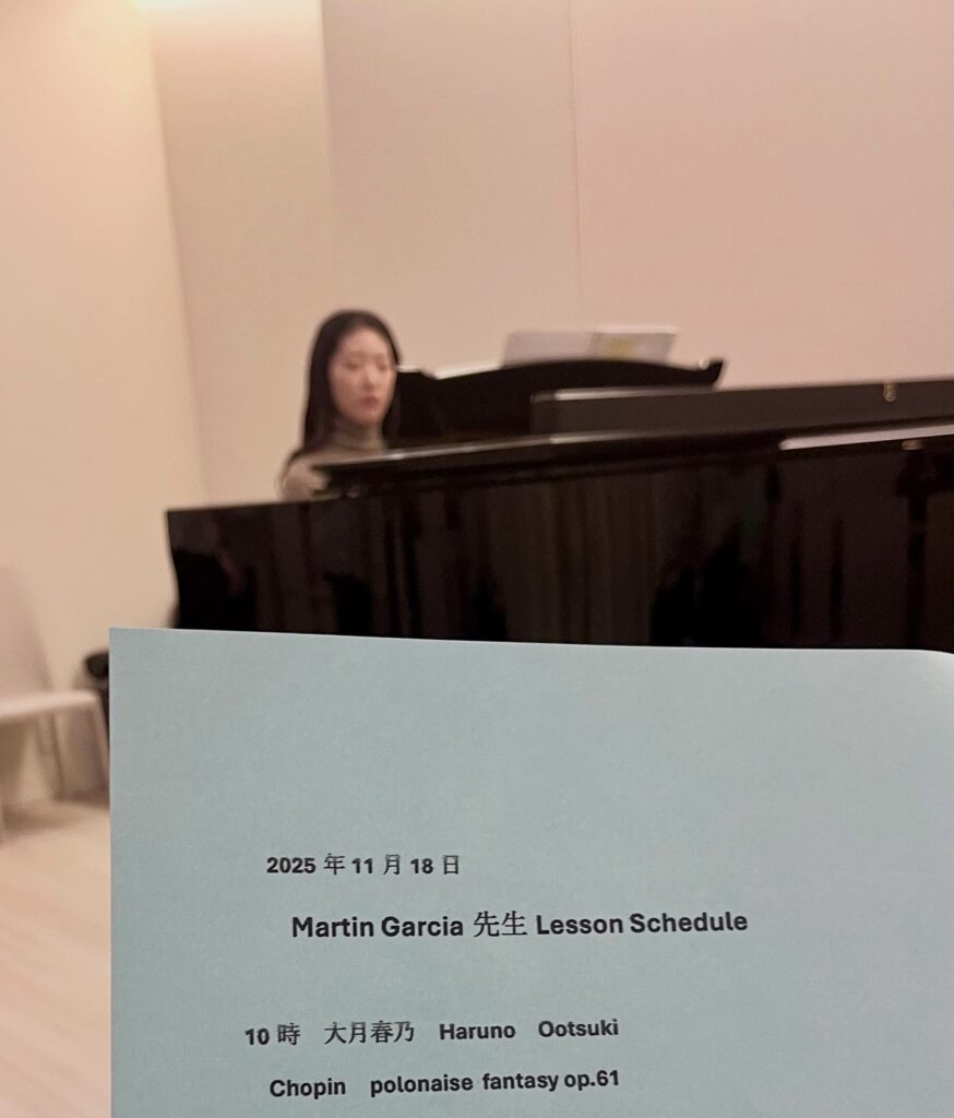 ショパン国際コンクール第3位のピアニスト、ガルシア先生のレッスンを東京で娘が受講させていただき、私も聴講してきました。今回は『幻想ポロネーズ』を2時間にわたりご指導いただき、本当にありがたく、胸がいっぱいになるほど素晴らしいレッスンでした。ガルシア先生のレッスンはこれで3回目ですが、今回は専属通訳の方までつけてくださり、深い学びの連続で、指先の細かな動かし方から、音楽の捉え方・表現の方向性まで、娘にとって大きな刺激となりました。先生曰く、この曲は「どんな年代のピアニストでも弾くのが怖い曲」で、ロマン派の中でも最もロマンティックな作品のひとつだそうです。先生ご自身も完成までに2年かかったとのことで…(娘は一体何歳で完成するのやら…😂)この学びを今後の演奏にしっかり生かし、そして来年から始まる生徒さんとのレッスンにも少しでも還元できればと思っています。道中では、神宮外苑いちょう並木や自由が丘の可愛らしいクリスマスツリーにも出会えて、とても素敵な東京の一日となりました🎄