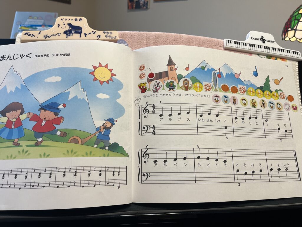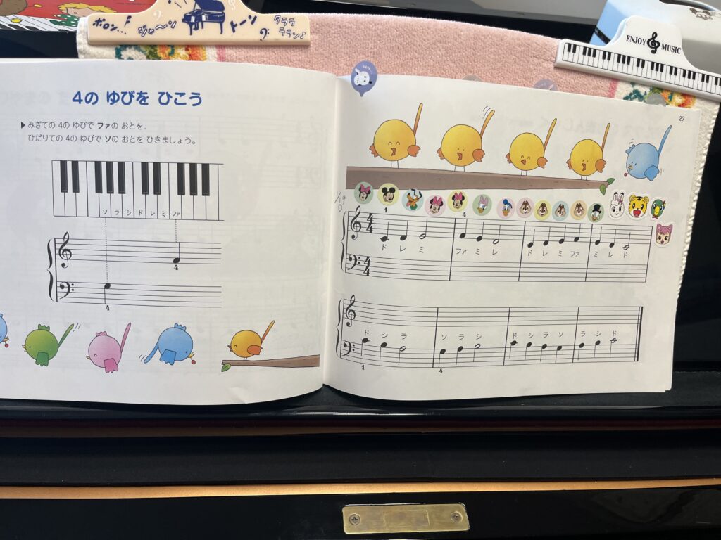 生駒市ピアノ教室の「クラヴィーア生駒」です。1月から習いに来てくれているS君は、シールを集めるのが大好き。練習できたらこんな感じで楽譜に貼ってくれています😀